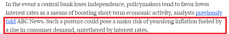 文章援引分析人士的话表示,如果美联储失去独立性,政策制定者往往会倾向于降低利率,以此来刺激短期经济活动。这种做法可能带来重大风险,即由不受利率约束的消费需求增长所推动的通胀将持续数年。
