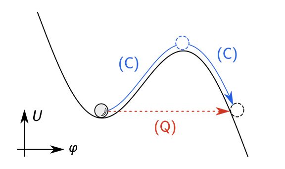 电流偏置约瑟夫森结的等效势能图示:在超导状态下,系统的动力学可用相位变量差φ的一维宏观运动描述。蓝色实线轨迹 (C) 对应经典物理规律下的「逃逸」路径——物体必须有足够的能量越过蓝色虚线位置所示的势能最高点;但即使物体能量不足以越过势垒,红色虚线指代的宏观量子隧穿过程 (Q) 仍然可以发生。在现实中,观察到明显的宏观量子隧穿现象所需要的实验温度通常远低于电路材料自身的超导临界温度。
