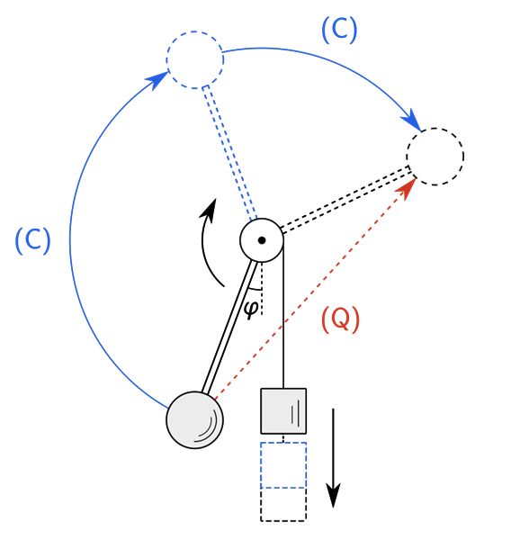 电流偏置约瑟夫森结的等价宏观力学模型:圆形单摆相对于竖直位置的夹角 φ 对应约瑟夫森结两侧的相位变量差;另一块方形重物通过细绳缠绕悬挂在摆轴上,代表外加偏置电流对系统能量的影响;蓝色实线 (C) 与红色虚线 (Q) 分别指代单摆顺时针摆至平面右侧的经典力学轨迹与量子隧穿过程。上下两图中以相同记号标注的物体势能局部最低点(黑色实线)、局部最高点(蓝色虚线)和逃逸后位置(黑色虚线)逐一对应——它们是同一物理模型的不同直观图像展示。